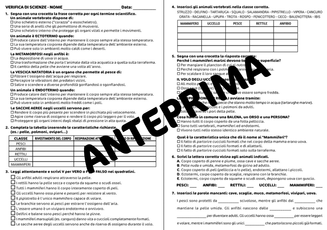 Quattro schede PDF, in formato A4 con verifica sugli animali vertebrati per la classe quarta. La verifica è strutturata con varie tipologie di domande (testo a buchi, tabelle, vero o falso).