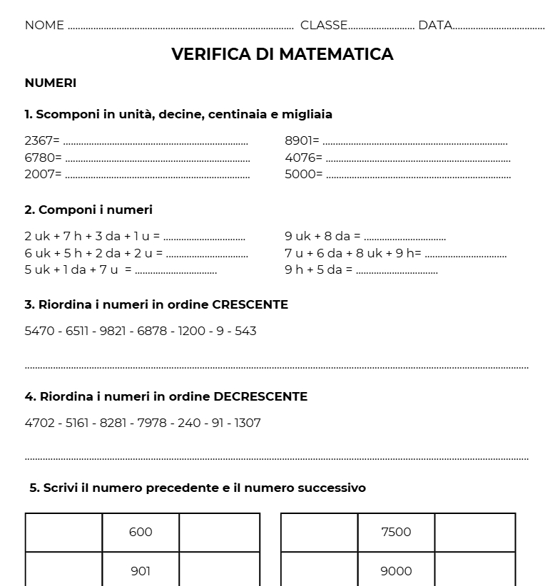 Questa è la verifica che proporrò ai miei alunni di terza. La verifica è divisa in sezioni: NUMERI, OPERAZIONI, GEOMETRIA (LINEE) E PROBLEMI. In questo modo i bambini potranno mettersi alla prova nella maggior parte dei nuclei fondanti della disciplina e sapranno su cosa concentrarsi in ogni parte della verifica.
