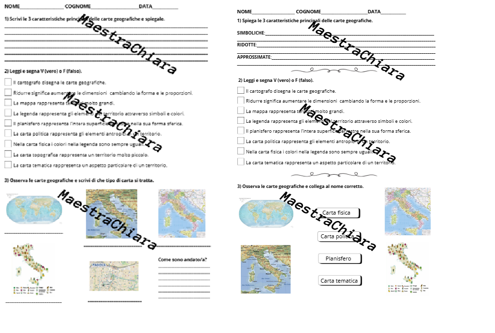 Verifica o esercitazione sul lavoro del cartografo, sulle caratteristiche delle carte geografiche e sui principali tipi di carte geografiche. Sono presenti varie tipologie di domande: domande aperte, vero o falso e scrittura della carta geografica corretta. E’ presente anche una versione semplificata per chi ha Bisogni Educativi Speciali.