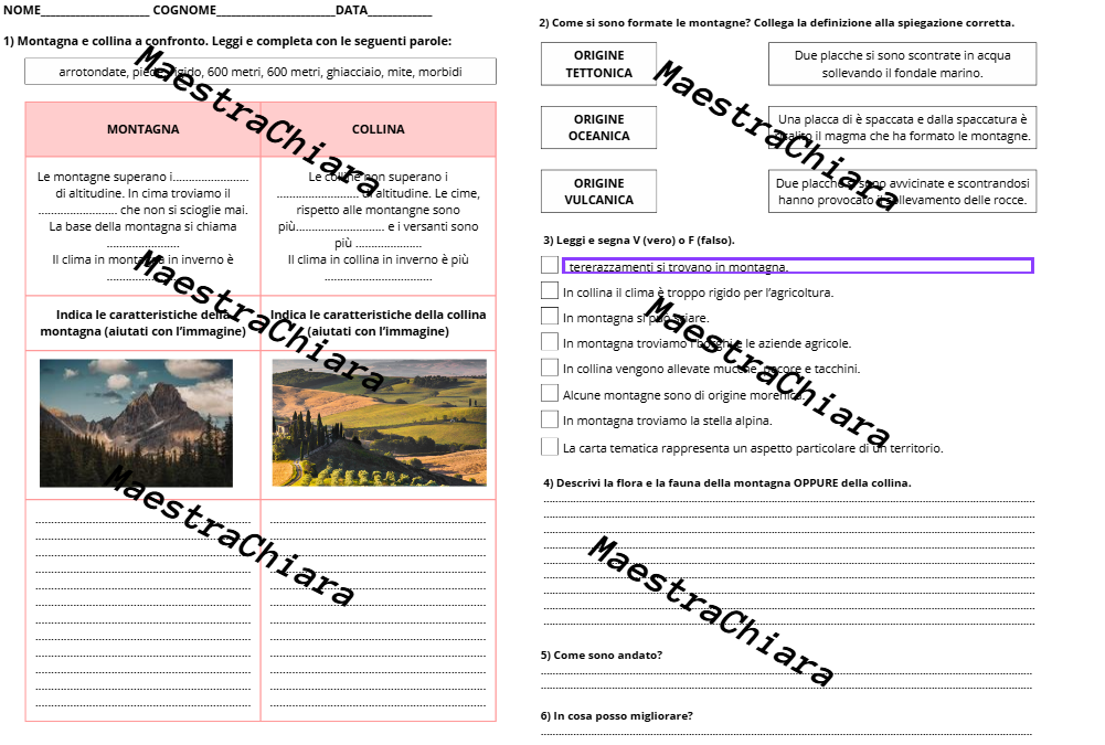 Una verifica o un’esercitazione sulla montagna e sulla collina con diverse modalità di domande (completamento, domande aperte, collegamento, vero o falso) con un sezione metacognitiva di riflessione sull’andamento dell’attività e su cosa si può migliorare.