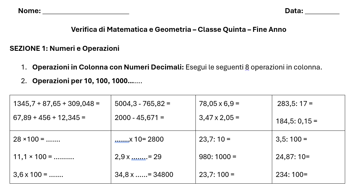 verifica con attività relative al programma di tutto l’anno scolastico per verificare le conoscenze. Verifica di passaggio per scuole medie