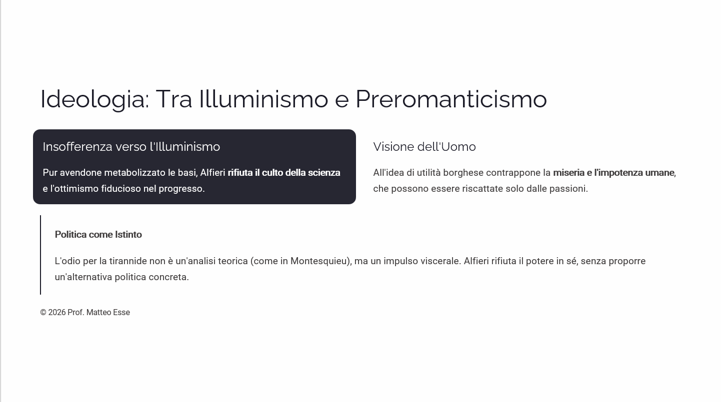 • Focus Opere e Stile: Approfondimento sulle tragedie (Saul, Filippo), sulla “Vita” e sul trattato Della Tirannide.