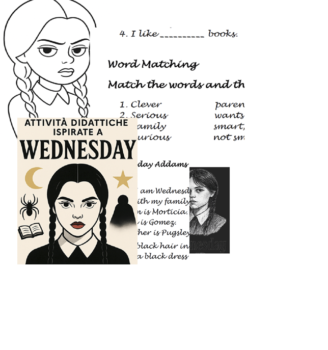 il lavoro che avete tra le mani include una serie di attività che sicuramente attireranno i vostri alunni trattandosi di un personaggio che a loro piace molto, quello di Mercoledì Addams, e che in vista di Halloween può essere adattato in maniera divertente.
