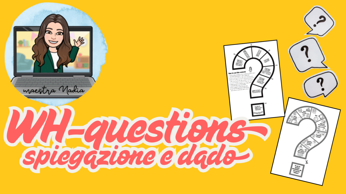 – un dado in formato A3 da stampare e assemblare per giocare in coppia o in gruppo a formulare domane con WH- e dare risposte